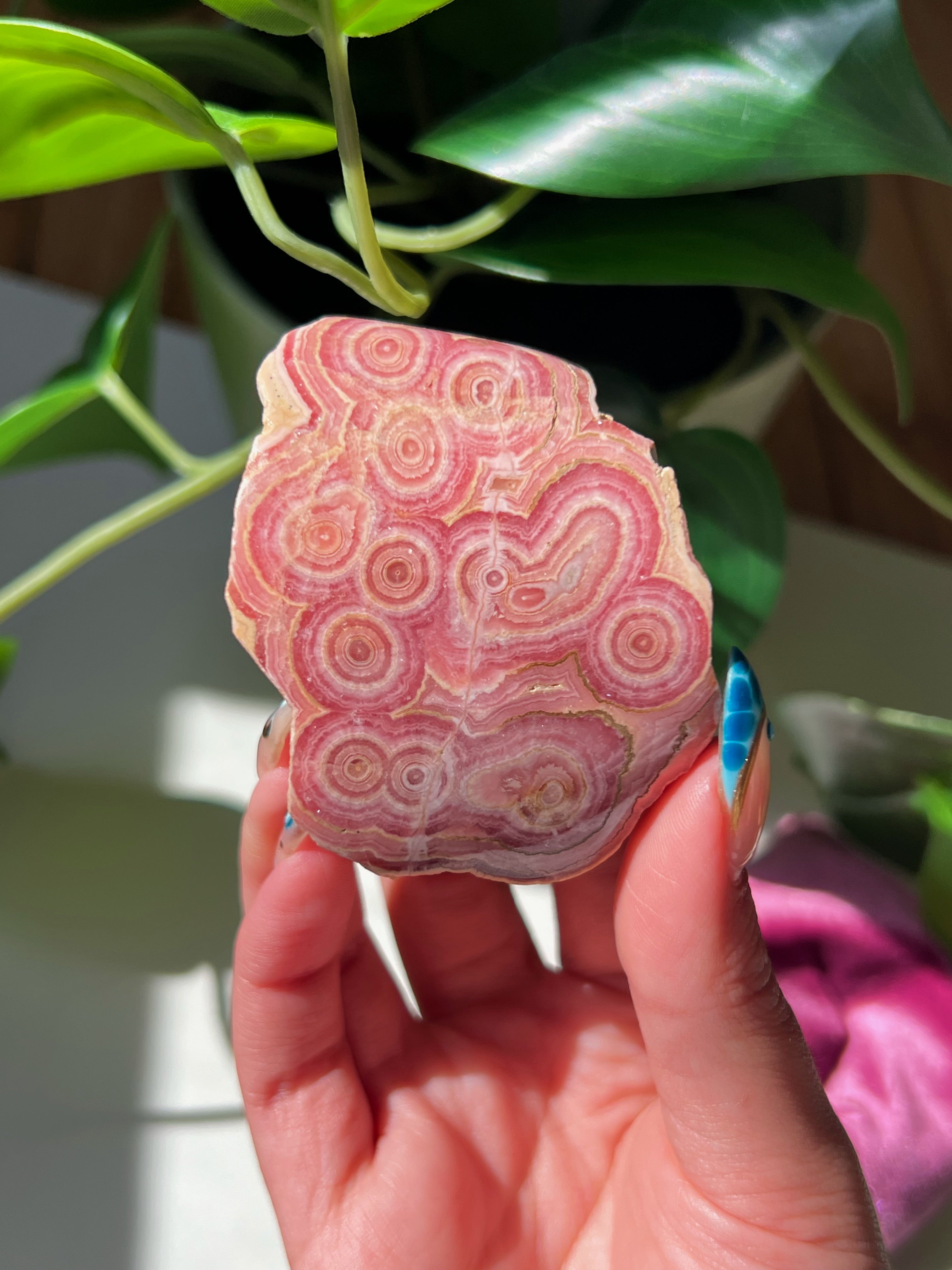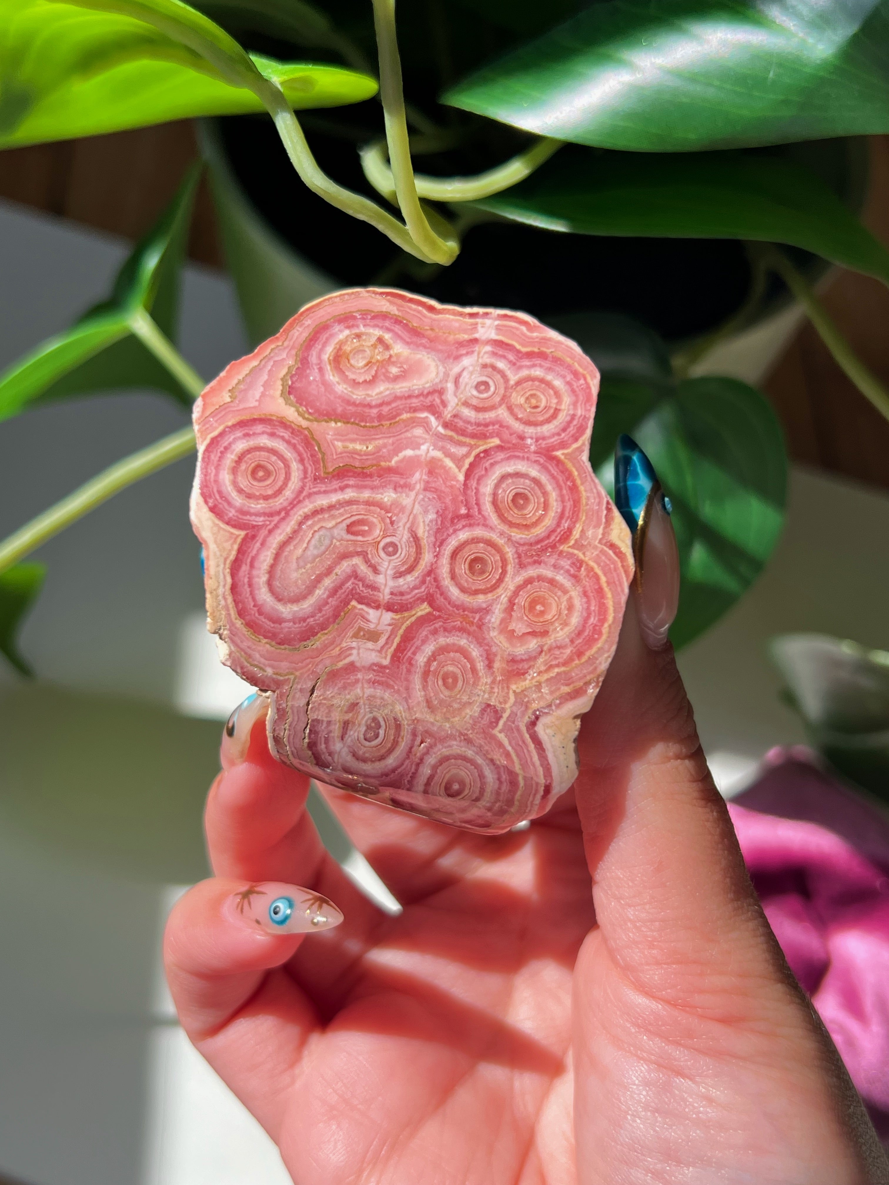 Rhodochrosite stalactite pieces are especially collectible due to the "bulls eye" patterning and the bright rich reds that these pieces exhibit. The name Rhodochrosite is derived from the Greek word ῥοδόχρως meaning rose colored. They form slowly over time as they create the beautifully banded specimens.